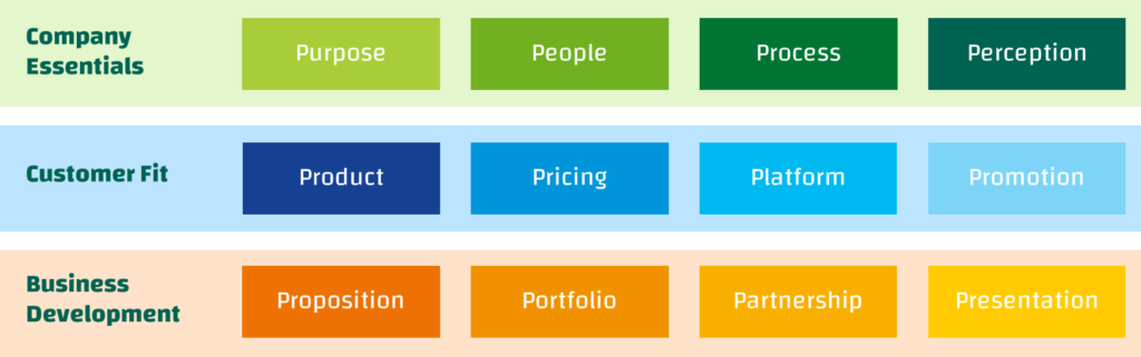 Na uitgebreid onderzoek en op basis van jarenlange ervaring hebben wij onze aanpak steeds verder verfijnd. Met deze kennis hebben we ons Marketing Performance Model © ontwikkeld, waarin we de B2B marketingmix completer hebben gemaakt en gemodelleerd naar 12 P’s, verdeeld over 3 clusters: Company Essentials, Customer Fit en Business Development.