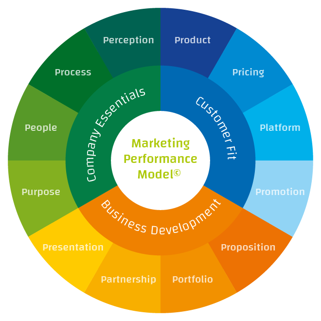 In ons Marketing Performance Model © is de basis van alle marketingactiviteiten terug te brengen tot 3 clusters: Company Essentials, Customer Fit, en Business Development.