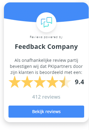 Op het moment van schrijven scoort PKIpartners een 9.4 gemiddeld, op basis van 412 reviews. Dat is een bijzonder hoge score die we duidelijk hebben laten terugkomen op de website. Dat versterkt de betrouwbaarheid van PKIpartners voor geïnteresseerde potentiële klanten enorm. Bijkomend voordeel is dat we het verzamelen van de reviews direct aangrijpen om ook te vragen naar verbeterpunten. Het werkt daarmee dus als doorlopend klanttevredenheidsonderzoek. Hierover vertelt onze merk- en marketingstrateeg Wiebe Heeres meer op de website van PKIpartners.