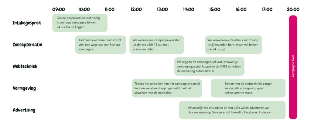 Had je campagne gisteren al live moeten zijn? Gisteren is natuurlijk onmogelijk, maar wij kunnen wel in no-time een krachtige online campagne voor je ontwikkelen en live zetten. Vanaf ieder moment dat jij het nodig hebt.